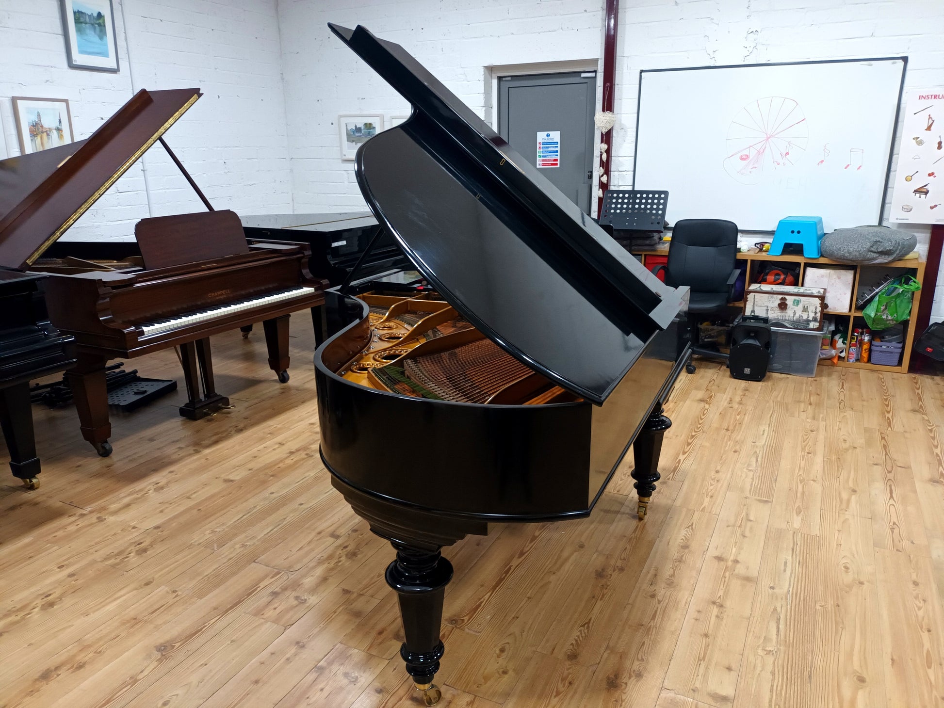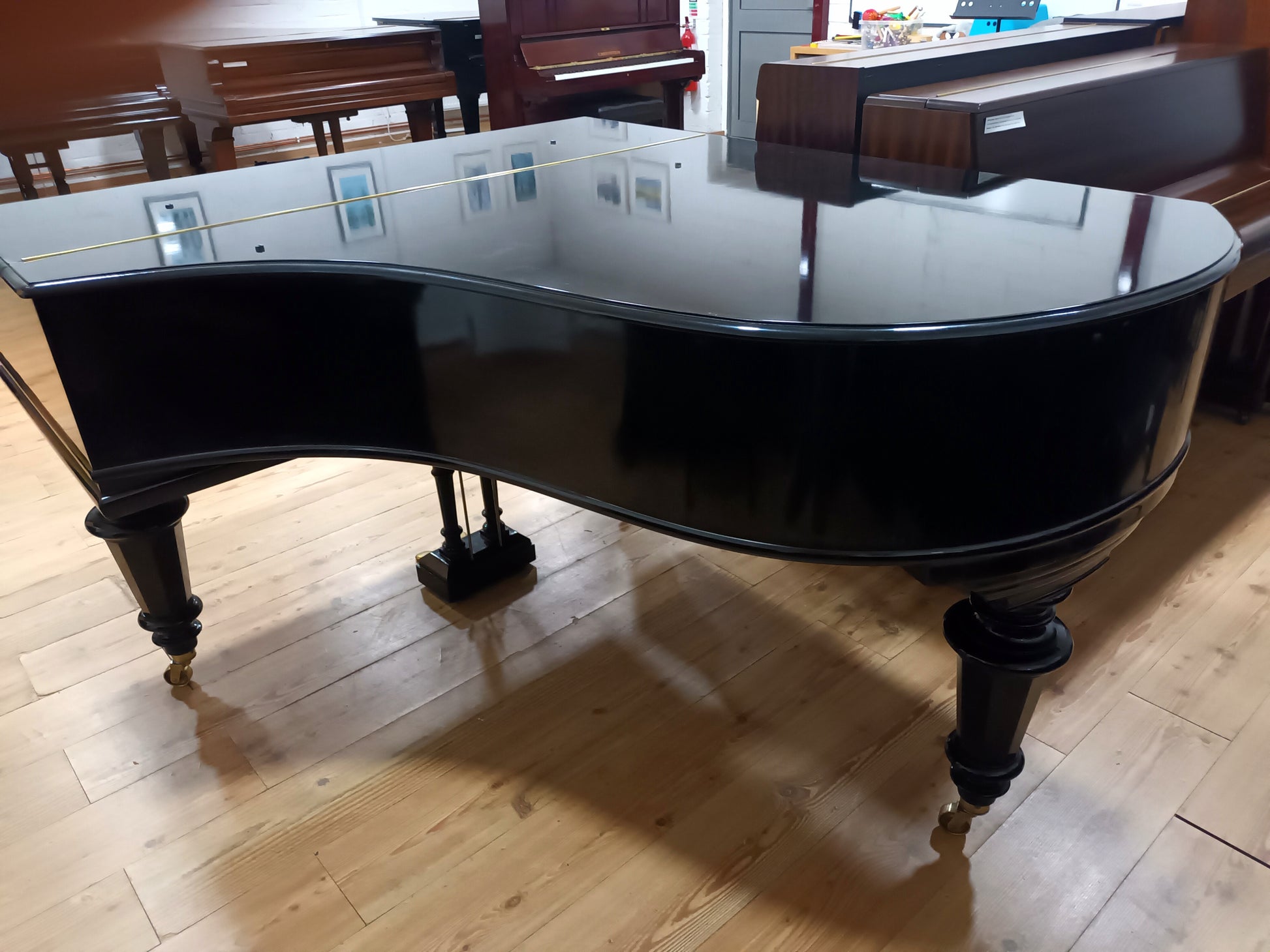 The Ivory keys are in excellent condition and the brass works are refinished. Large brass wheels for ease of movement and strong turned legs.