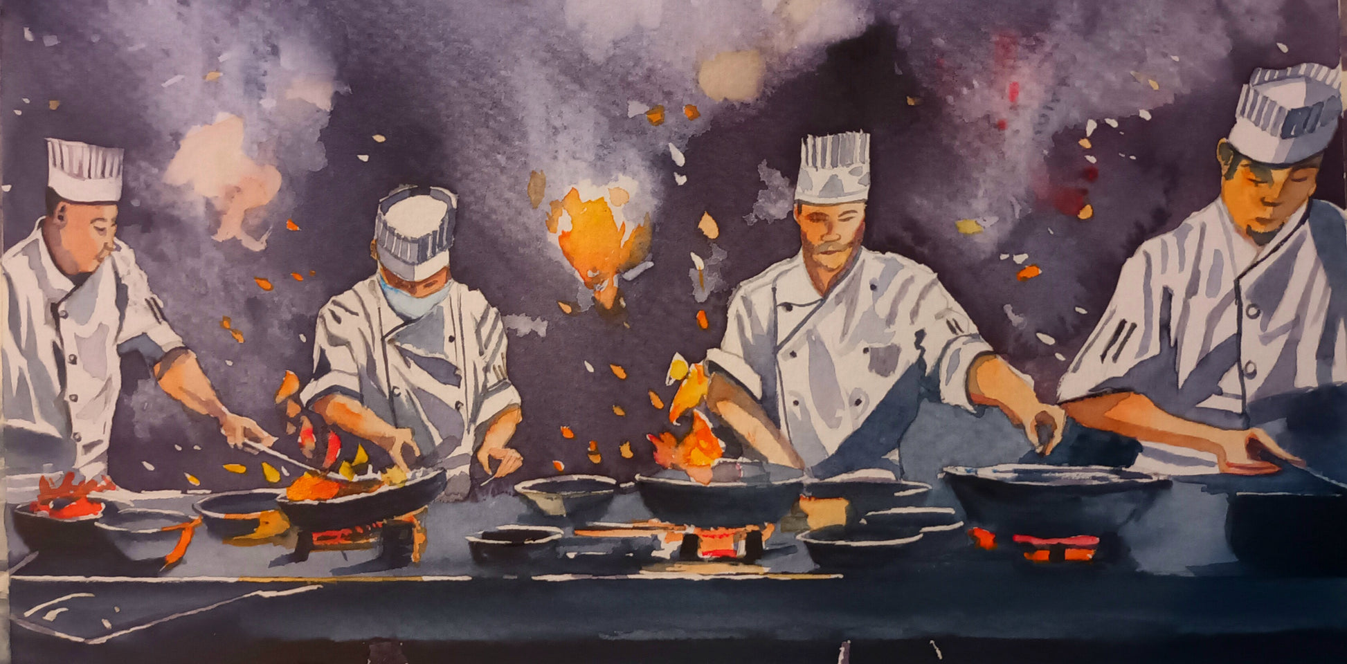 A3 size original Watercolour painting of Chefs working in a busy kitchen, by Cathal O'Briain.