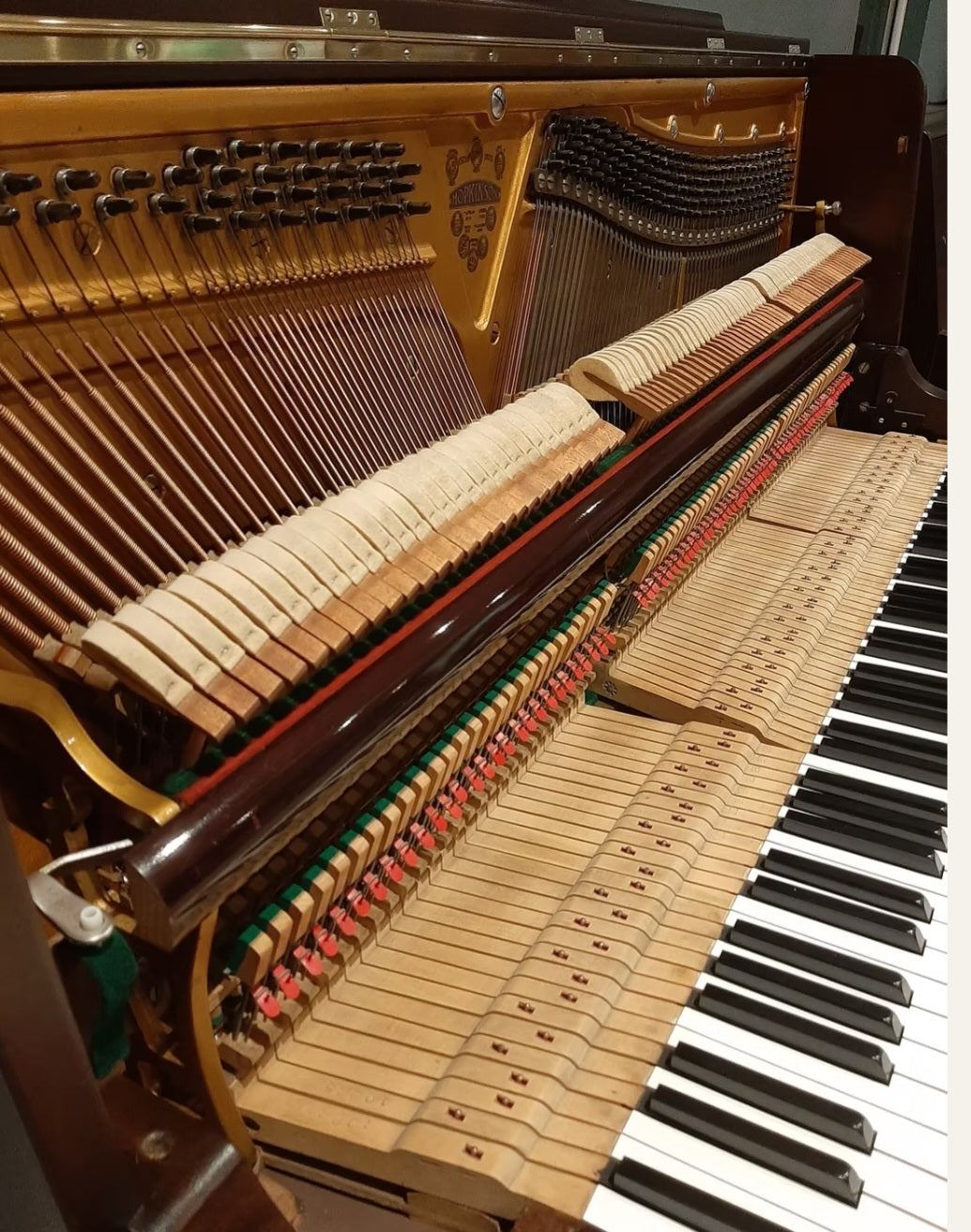 The 85 note keyboard has been cleaned and the celluloid key coverings buffed.