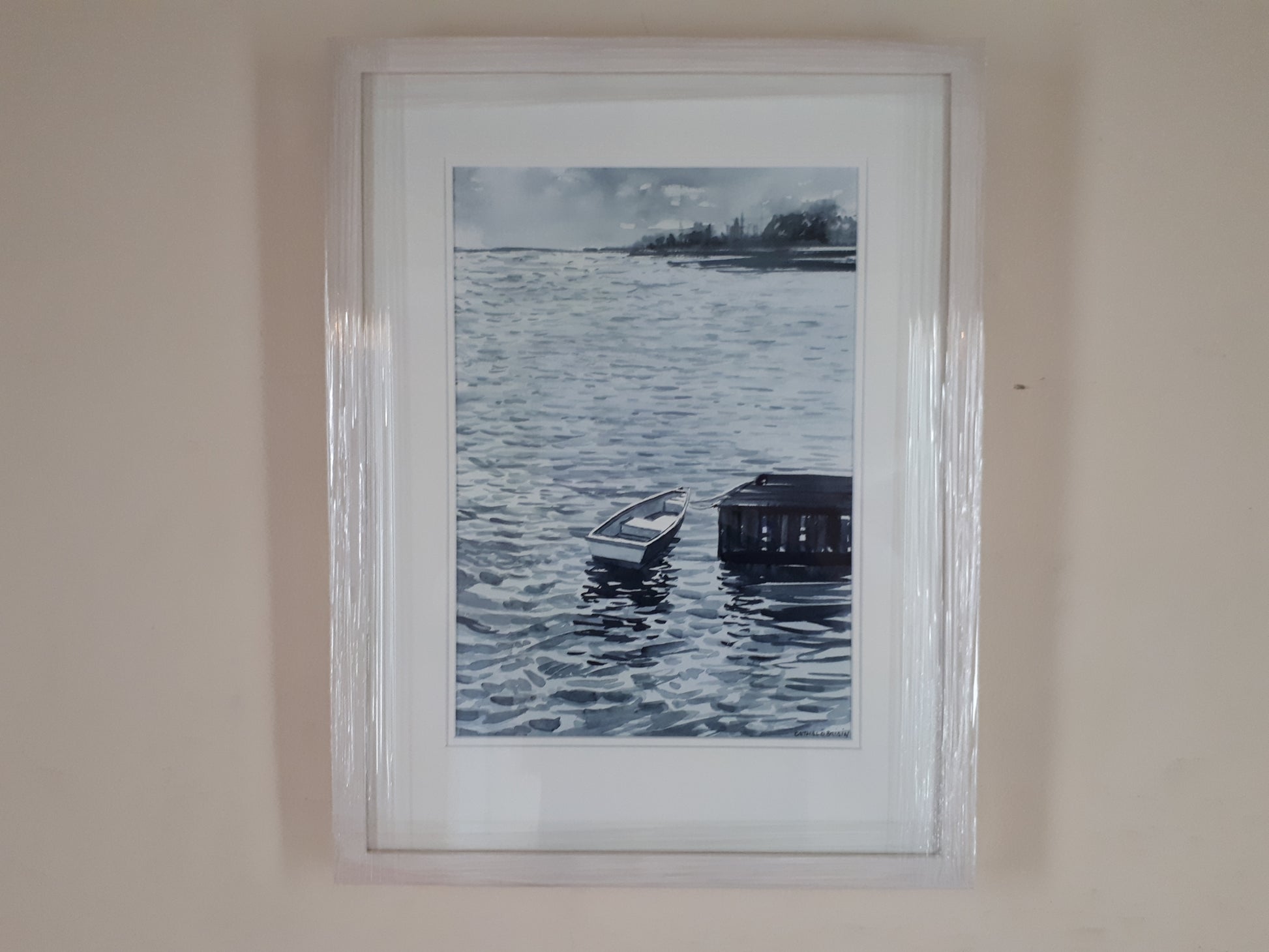 This painting comes professionally framed in a new, off-white, neutral coloured frame to suit most interior styles and settings. The back is sealed and there is a string for hanging.