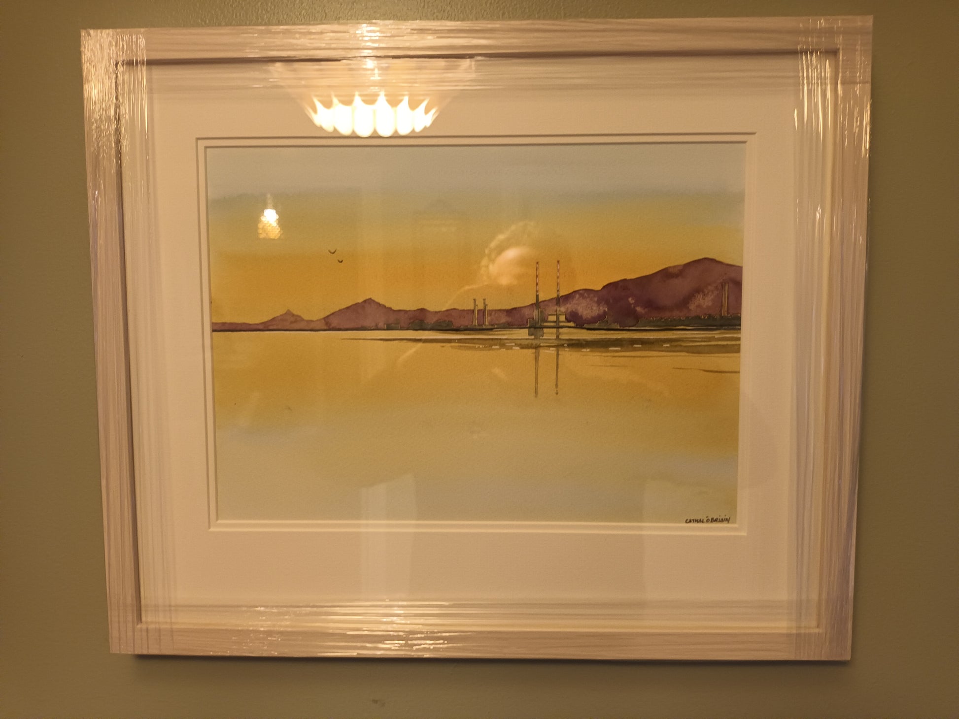 This painting comes professionally framed in a new, neutral coloured frame to most interior styles and settings. Frame is by Gorey Framing, County Wexford. There is an example on this page of a neutral coloured frame. The back is sealed and there's a string for hanging.